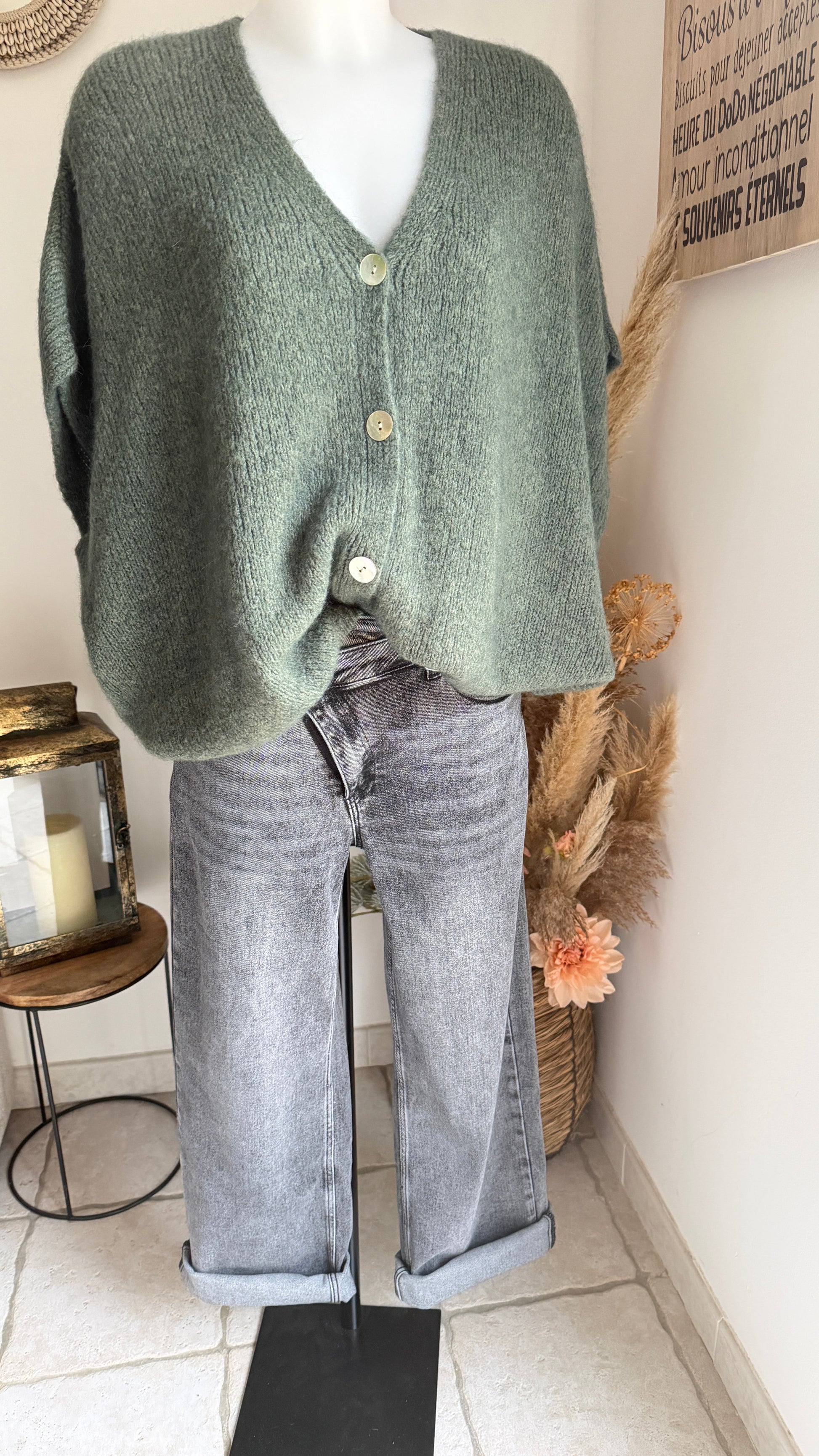Existe en taupe, vert, beige et blanc.