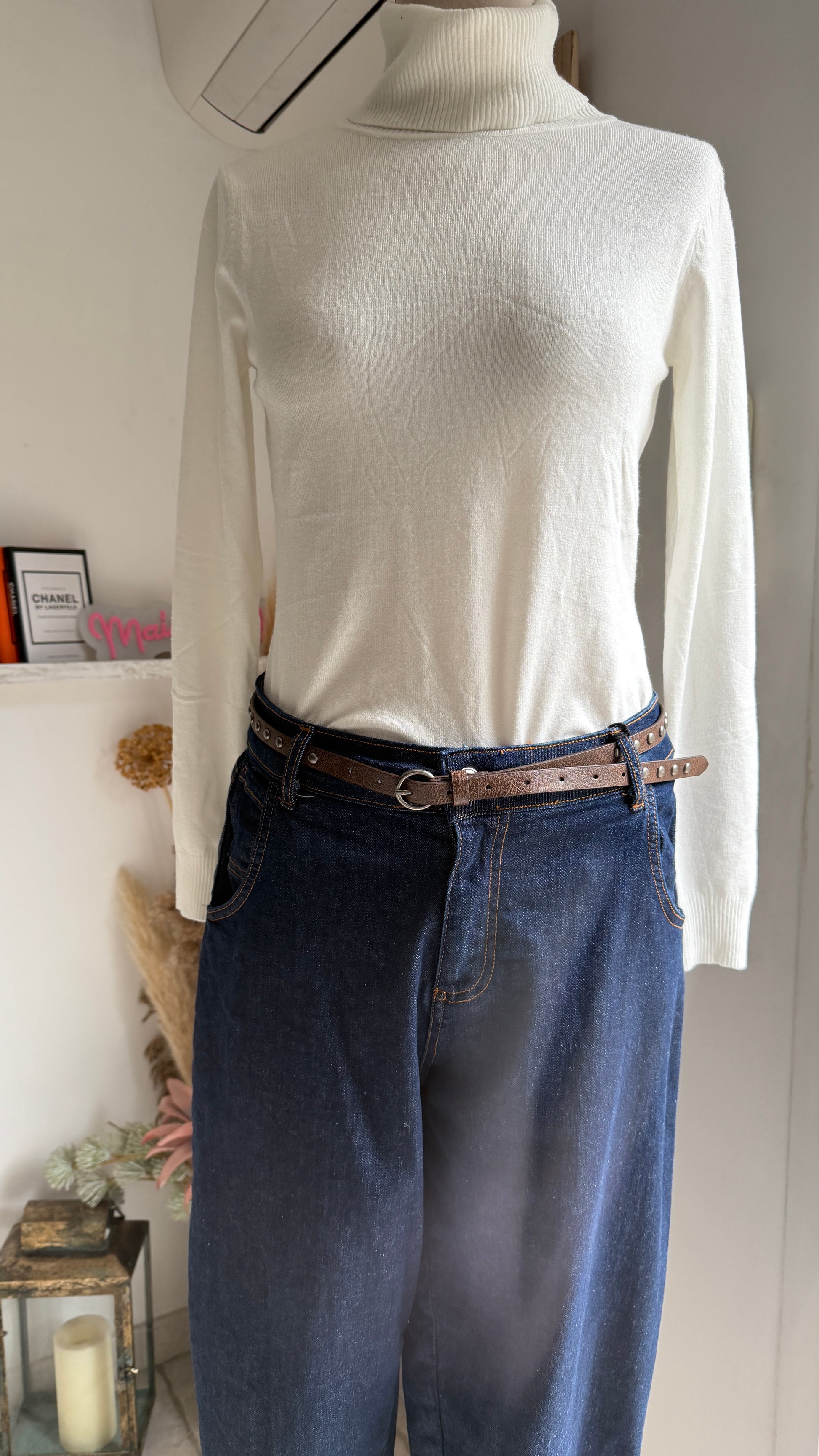 Découvrez ce jean denim bleu foncé à la coupe boyfriend généreuse et confortable. Doté de quatre poches pratiques et d'une ceinture fine ornée de clous, il allie style et fonctionnalité. Composé de 95% coton et 2% élasthanne, il offre une belle tenue avec une touche de stretch pour plus de liberté de mouvement.
