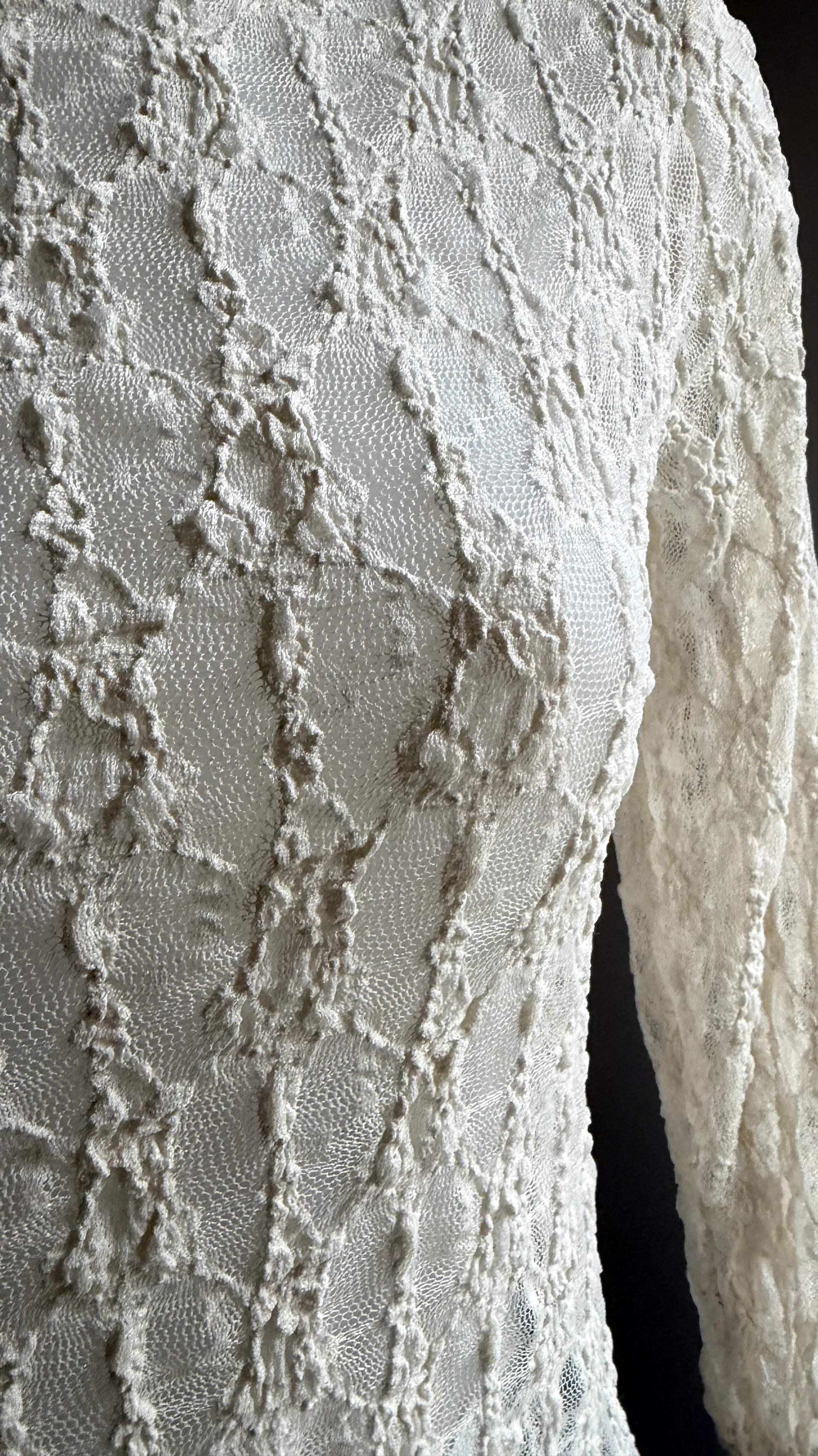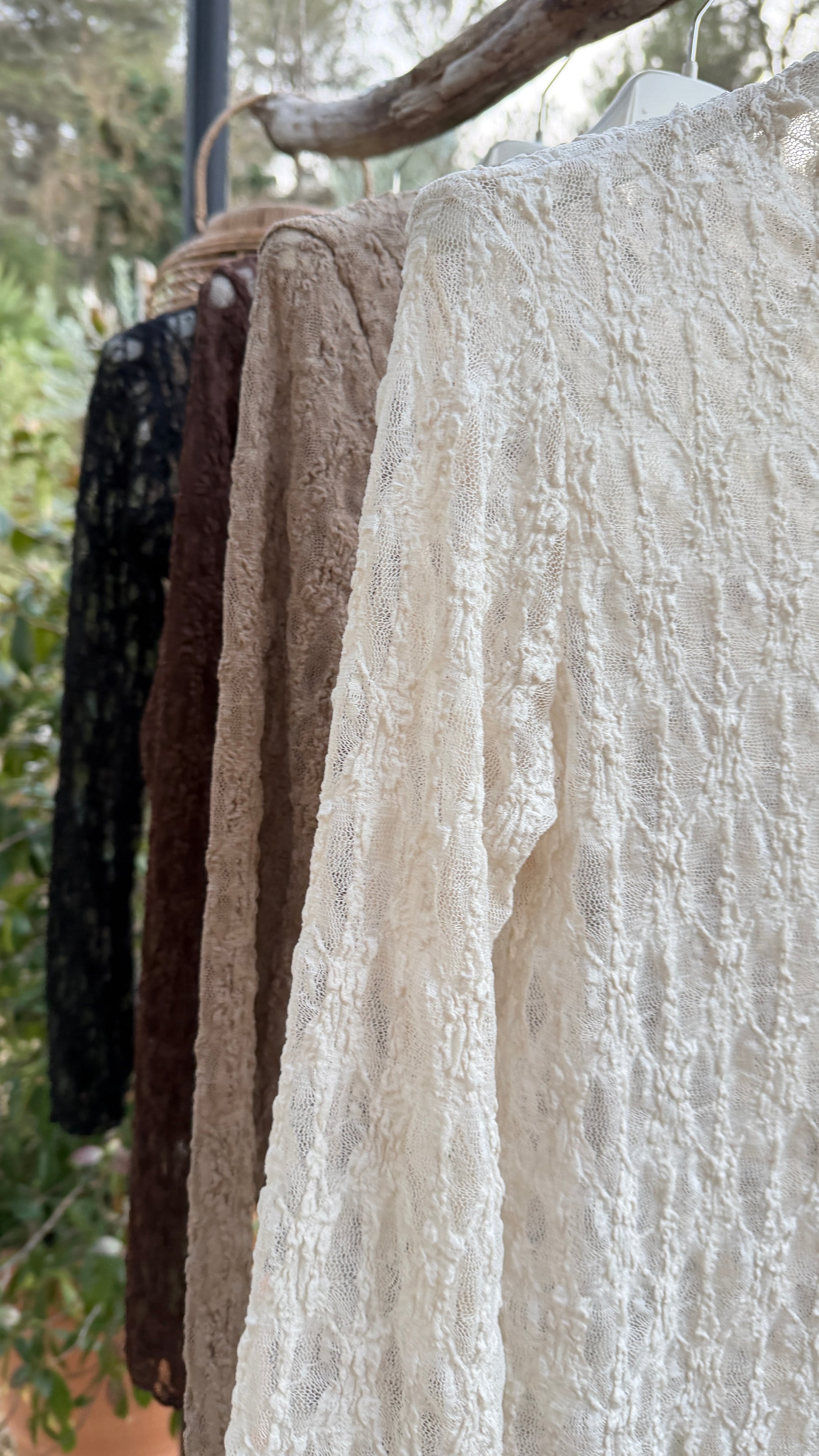 Élégant top en dentelle avec col montant et manches longues. Confectionné dans un mélange de polyester et spandex, il offre une excellente élasticité pour un confort optimal.